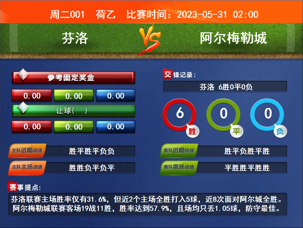 比賽時間:2023-05-31 02:00賽事提點(diǎn):芬洛聯(lián)賽主場勝率僅有31.6%,但近2個主場全勝打入5球,近8次面對阿爾城全勝。阿爾梅勒城聯(lián)賽客場19戰(zhàn)11勝,勝率達(dá)到57.9%,且場均只丟1.05球,防守最佳。