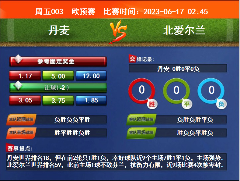 比賽時(shí)間:2023-06-17 02:45賽事提點(diǎn):丹麥?zhǔn)澜缗琶?8,但在前2輪只1勝1負(fù),幸好球隊(duì)近9個主場7勝1平1負(fù),主場強(qiáng)勢。北愛爾蘭世界排名59,此前主場1球不敵芬蘭,抗衡力有限,近9場比賽4次被零封。