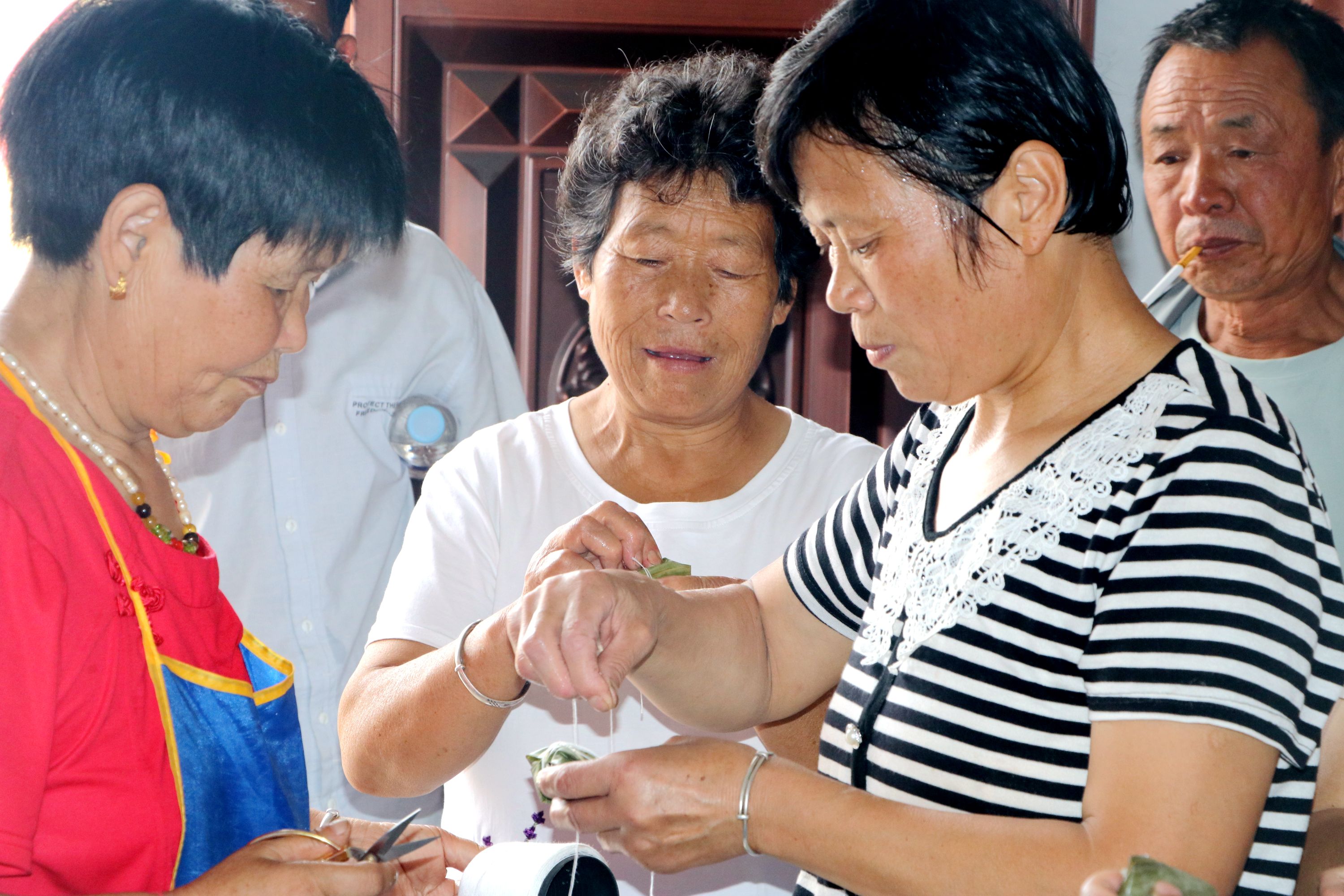 一大早,宋福利就組織村“兩委”成員將泡好的糯米、紅豆、蜜棗、粽葉等材料整齊地擺放在桌子上,做好包粽子準備工作?;顒右婚_始,大家就迅速進入包粽子狀態(tài),圍在一起,使出看家本領,捋粽葉、做漏斗狀、填糯米、壓緊實、封口、扎捆……在粽葉翻飛、米香四溢中,翠綠的粽葉和晶瑩的糯米在一雙雙巧手中瞬間變成了一個個清香誘人的粽子。大家一邊包粽子,一邊嘮家常,說著、笑著,一片融洽和諧。經(jīng)過1個多小時的辛勤勞作,粽子包好了,宋福利和老人們把包好的粽子分成若干份,送給村里行走不便的低保戶、獨居老人、“五保”老人,并與他們進行交談,了解他們近期的生活情況,叮囑他們保重身體。
