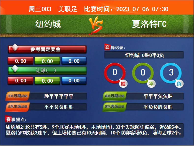 比賽時間:2023-07-06 07:30賽事提點:紐約城21輪只有5勝,9個聯(lián)賽主場4勝,主場場均1.33個丟球防守偏弱,近6戰(zhàn)5平。夏洛特FC收獲3連平,但上場比賽已有10天間隔,10個聯(lián)賽客場5負,場均丟球2個。