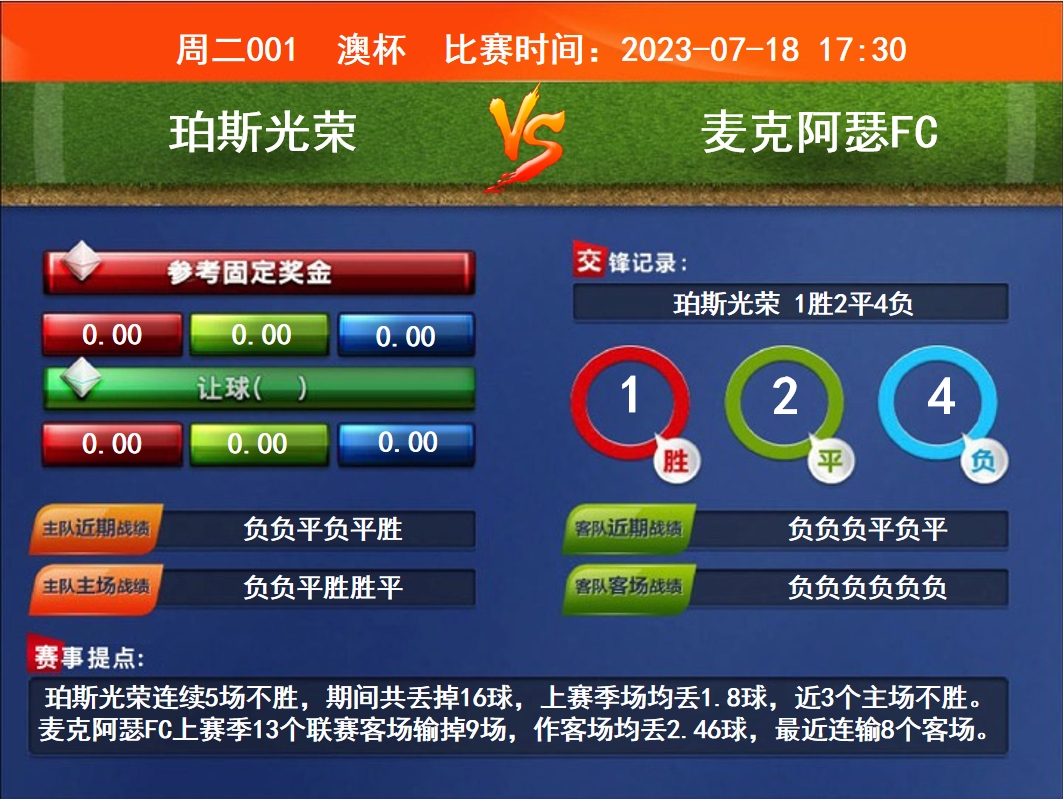 比賽時間:2023-07-18 17:30賽事提點:珀斯光榮連續(xù)5場不勝,期間共丟掉16球,上賽季場均丟1.8球,近3個主場不勝。麥克阿瑟FC上賽季13個聯(lián)賽客場輸?shù)?場,作客場均丟2.46球,最近連輸8個客場。