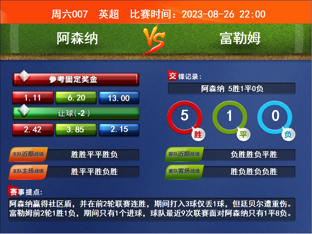 比賽時(shí)間:2023-08-26 22:00賽事提點(diǎn):阿森納贏得社區(qū)盾,并在前2輪聯(lián)賽連勝,期間打入3球僅丟1球,但廷貝爾遭重傷。富勒姆前2輪1勝1負(fù),期間只有1個(gè)進(jìn)球,球隊(duì)最近9次聯(lián)賽面對(duì)阿森納只有1平8負(fù)。