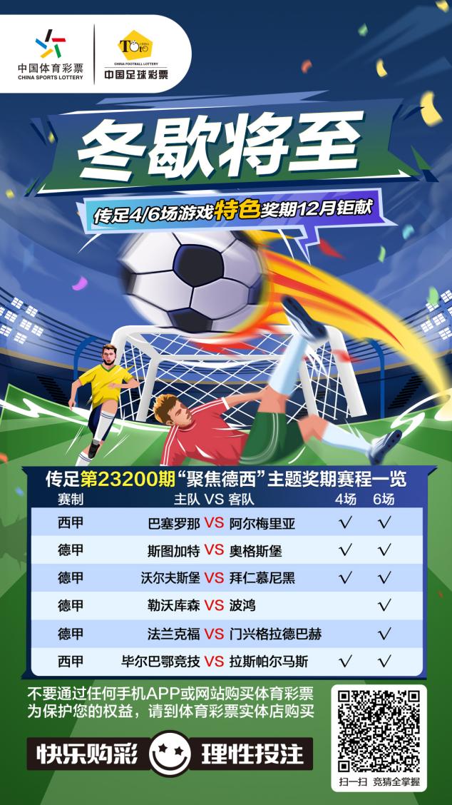 第23200期傳足特色獎期已經(jīng)于12月17日20:00開售,將于12月20日22:00停售,并于12月21日開獎。其中沃爾夫斯堡VS拜仁慕尼黑、斯圖加特VS奧格斯堡、巴塞羅那VS阿爾梅里亞和畢爾巴鄂競技VS拉斯帕爾馬斯為4場進(jìn)球游戲競猜賽事。