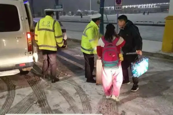 當(dāng)男子的女兒順利到達(dá)高鐵站后,交警們又將他送回原地??吹骄仍藛T已經(jīng)到達(dá),交警們?cè)俅瓮度氲窖┮沟难策壷?。他們的熒光黃制服與白雪交相輝映,成為雪夜里最溫暖的色彩。②2