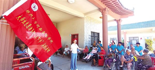 8月16日,鄭州大學大學生(左一)為太康縣高賢鄉(xiāng)汪莊村醫(yī)養(yǎng)院的老人們演唱歌曲。當日,由鄭州大學河南音樂學院、哲學學院大學生王子奇、王子祎、邵彤組成的“三下鄉(xiāng)”服務(wù)小分隊走進該醫(yī)養(yǎng)院,開展“情暖夕陽·愛駐心間”社會實踐活動,為生活在這里的老人們打掃衛(wèi)生、表演節(jié)目,醫(yī)養(yǎng)院里充滿了其樂融融的氛圍。