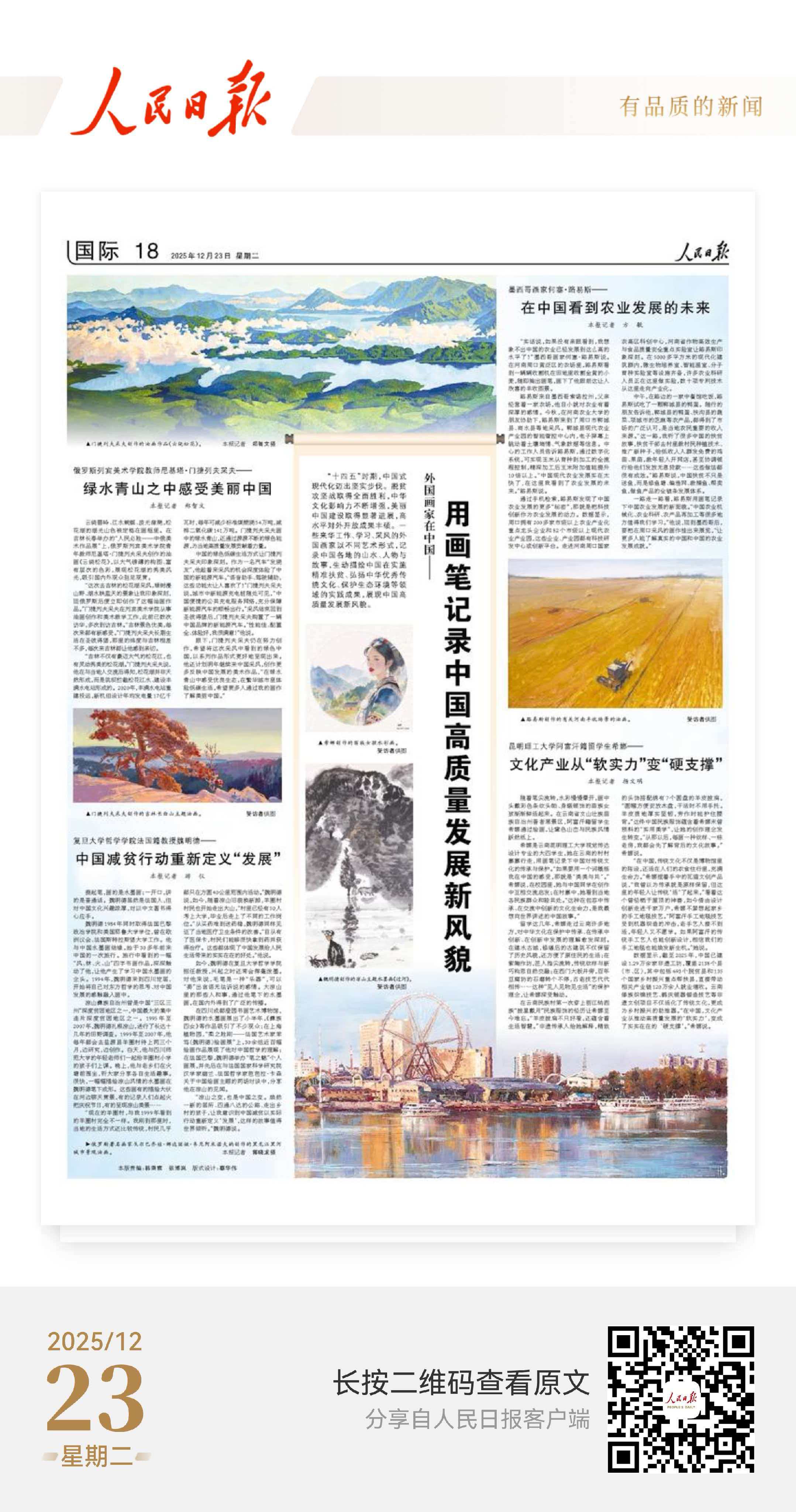 “十四五”時(shí)期,中國式現(xiàn)代化邁出堅(jiān)實(shí)步伐。脫貧攻堅(jiān)戰(zhàn)取得全面勝利,中華文化影響力不斷增強(qiáng),美麗中國建設(shè)取得顯著進(jìn)展,高水平對(duì)外開放成果豐碩。一些來華工作、學(xué)習(xí)、采風(fēng)的外國畫家以不同藝術(shù)形式,記錄中國各地的山水、人物與故事,生動(dòng)描繪中國在實(shí)施精準(zhǔn)扶貧、弘揚(yáng)中華優(yōu)秀傳統(tǒng)文化、保護(hù)生態(tài)環(huán)境等領(lǐng)域的實(shí)踐成果,展現(xiàn)中國高質(zhì)量發(fā)展新風(fēng)貌。