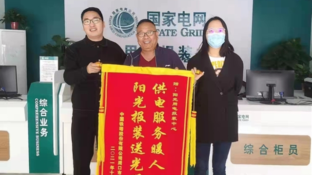 近日,在國(guó)網(wǎng)周口供電公司陽(yáng)光報(bào)裝中心,中國(guó)鐵塔股份有限公司周口分公司業(yè)務(wù)經(jīng)理朱義嶺一邊將印有“供電服務(wù)暖人心 陽(yáng)光報(bào)裝送光明”的錦旗遞給供電工作人員,一邊感謝該公司對(duì)鐵塔基站建設(shè)提供的支持。