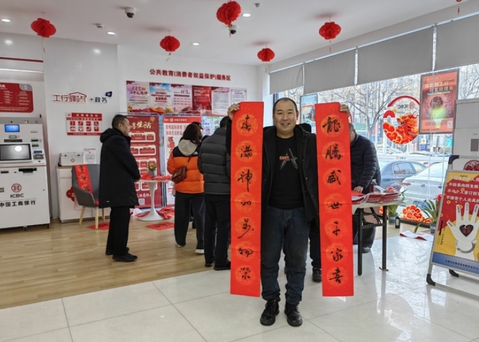 新春佳節(jié)來(lái)臨之際,工行周口分行傳承中華民族習(xí)俗,積極營(yíng)造歡樂(lè)祥和吉慶的節(jié)日氛圍,精心組織本行書(shū)法家和書(shū)法愛(ài)好者在營(yíng)業(yè)網(wǎng)點(diǎn)開(kāi)展“寫(xiě)春聯(lián)送福字賀新年”活動(dòng),為廣大群眾送上新春美好祝福。