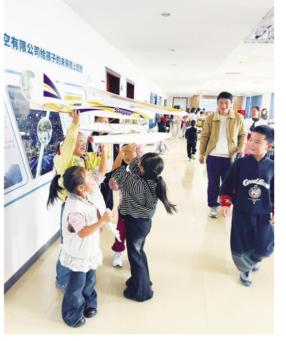 小記者近距離觀察航模。近日,周口日?qǐng)?bào)小記者部攜手周報(bào)航空俱樂(lè)部,組織70余名小記者開(kāi)展了一場(chǎng)別開(kāi)生面的無(wú)人機(jī)科普研學(xué)活動(dòng),小記者在沉浸式體驗(yàn)中感受到了科技的魅力。