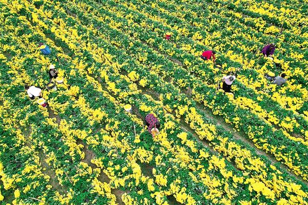 11月13日,項(xiàng)城市新橋鎮(zhèn)南趙村村民在田間采摘金絲皇菊。剛剛離枝的新鮮菊花隨即被送往村里的加工車間烘干,之后由專業(yè)合作社統(tǒng)一收購并對外銷售。