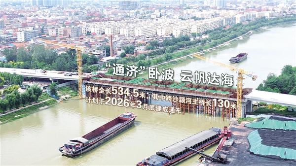 9月16日上午,建設(shè)中的項(xiàng)城通濟(jì)大道橋臥波于沙潁河之上,貨船從30米寬的通航孔緩緩馳過,保障豫貨出海。