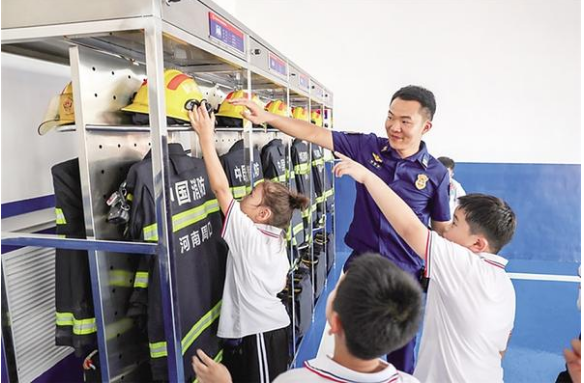在市消防救援支隊,孩子們近距離接觸消防裝備。近日,一場別開生面的“學應急技能、筑平安基石”周口市青少年安全科普研學之旅成功舉辦。