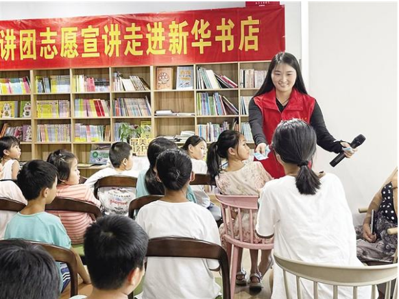 7月29日,大學生宣講團成員與小讀者互動。當日,商水縣新華書店內笑聲不斷,大學生宣講團成員、該縣新城街道返鄉(xiāng)學子朱慧敏為小讀者們帶來了一場智慧與歡樂交融的宣講活動。
