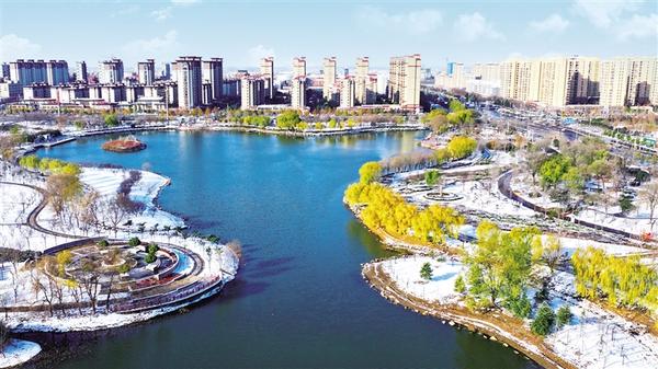 12月13日,扶溝縣人民公園白雪皚皚、天藍(lán)水清、柳樹(shù)正黃,與遠(yuǎn)處聳立的高樓,共同構(gòu)成一幅絕美畫(huà)卷,成為市民休閑散步的好去處。