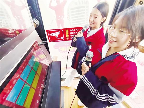 兩名女生利用課余時間在校園KTV唱吧內(nèi)放聲歌唱。