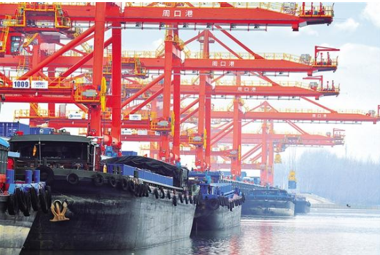 寒冬時節(jié)的沙潁河,一艘艘船舶停靠在周口中心港,高聳岸橋忙碌地裝卸集裝箱,運輸車輛穿梭如織。這里擁有黃金航道,航道水深5米以上,有效行船寬距超過50米,既是河南省乃至淮河流域規(guī)模最大、靠泊能力最強的內(nèi)河港口,也是全國36個內(nèi)河主要港口之一。
