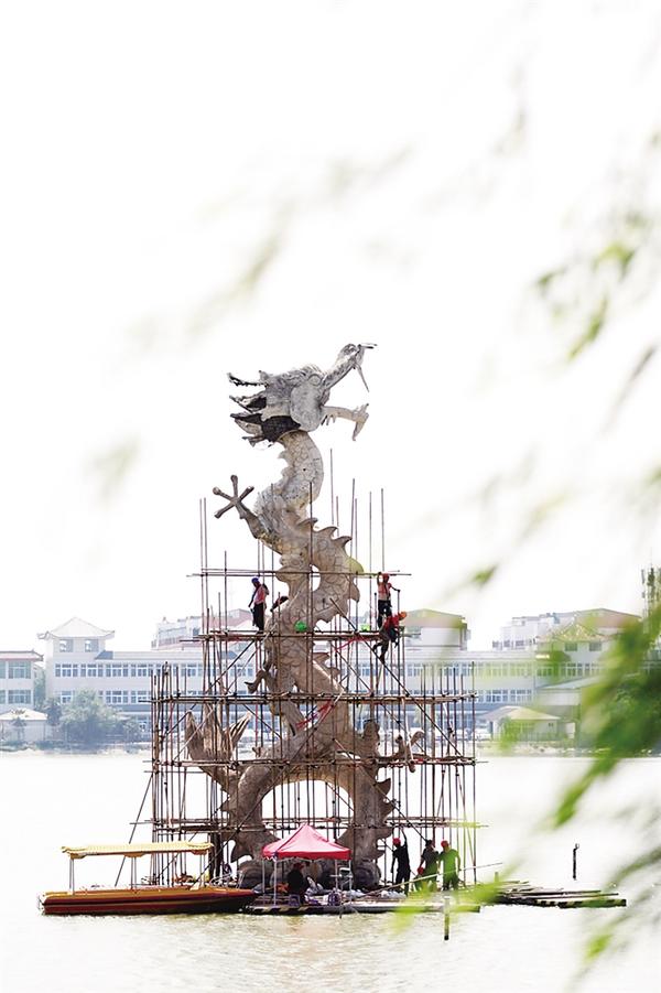 6月5日,建筑工人在搭建腳手架,開始對淮陽龍湖中的9座龍形雕塑進(jìn)行修繕。