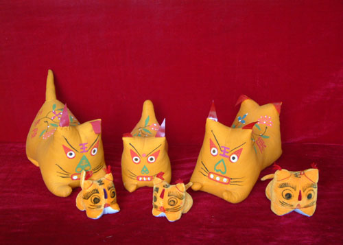 在淮陽古廟會上,隨處可以看到琳瑯滿目的布老虎,有單頭虎、雙頭虎、直臥虎、側(cè)臥虎、玩具虎、枕頭虎等,形態(tài)各異,大小不一。這些老虎不是深山老林中那種兇猛的野獸,而是裝飾化、人格化了的布玩……[詳細(xì)]
