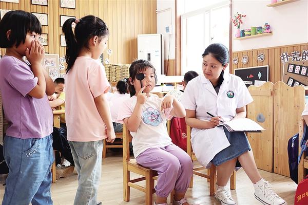 5月19日,扶溝縣中醫(yī)院眼科醫(yī)務(wù)人員來(lái)到扶溝縣直幼兒園為小朋友檢查視力。近日,扶溝縣多家幼兒園開(kāi)展“愛(ài)眼護(hù)眼從小做起”主題活動(dòng),邀請(qǐng)醫(yī)務(wù)人員為小朋友講解眼科知識(shí),并為小朋友進(jìn)行視力檢查。