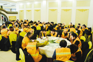 本報(bào)訊 (記者 徐啟峰 通訊員 劉巍 文/圖) 2月17日,農(nóng)歷臘月二十九上午,愛心人士韓平為川匯區(qū)環(huán)衛(wèi)工人送去棉大衣,并邀請(qǐng)環(huán)衛(wèi)工人共進(jìn)午餐(如圖)。