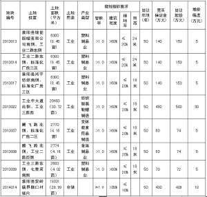 備注:1.2013013、2013014、2013017、2013022、2013037、2013038、2013039宗地位于產(chǎn)業(yè)集聚區(qū)內(nèi),屬兩層以上標準化廠房建設用地,投資強度≥3750萬元/公頃。地上有部分違法建筑物,經(jīng)政府辦、發(fā)改委、財政局、監(jiān)察局、法制辦、住建局、審計局、房產(chǎn)辦、規(guī)劃辦、城市綜合執(zhí)法局和縣產(chǎn)業(yè)集聚區(qū)管委會集體研究,地上建筑不再作價與土地捆綁出讓,由土地競得人無償處置地上建筑物。土地出讓合同簽訂后,8個月內(nèi)必須開工建設,工期24個月,土地成交價款需在土地出讓合同簽訂后60日內(nèi)繳清,交地時間在3個月內(nèi)。
