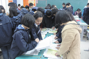 該校將課堂名字定為“求真大課堂”,以“真”字作為學(xué)校一切教育教學(xué)和管理的衡量標(biāo)準(zhǔn)。朱貴華說,求真就是要真教、真學(xué)、真嚴(yán)、真愛、真實、真會。為提高課堂教學(xué)效果,該??偨Y(jié)出一套獨特的課堂教學(xué)方法——“七音和鳴”。分管教學(xué)工作的副校長徐其運用“1234567”,即哆來咪發(fā)唆拉西”來詮釋“七音和鳴”法?!?”就是一個學(xué)習(xí)目標(biāo);“2”就是提前兩分鐘進班,布置2個任務(wù)(出示目標(biāo)、檢查學(xué)情);“3”就是準(zhǔn)備3個本子,即學(xué)情檢效本、跟蹤本、糾錯本;“4”是4個維度考評,即高速度、準(zhǔn)確度、干凈度、參與度;“5”是5個跟蹤,即節(jié)跟蹤、日跟蹤、周跟蹤、月跟蹤、學(xué)期跟蹤,堅持“抓緊跟蹤不放松、我在文昌必成功”的教育信念;“6”是6個環(huán)節(jié),即激情導(dǎo)入、自研自探、合作探究、展示質(zhì)疑、師生點評、當(dāng)堂檢測;“7”是7個評價,即教師的教案、學(xué)生的學(xué)案、練案、觀課記錄的每周業(yè)務(wù)評價及對學(xué)生的即時性、激勵性、長效性評價。