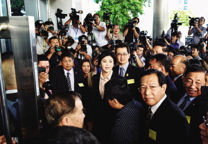 泰國(guó)最高法院首次開(kāi)庭審理英拉“大米案” 5月19日,在泰國(guó)曼谷,泰國(guó)前總理英拉(中)到達(dá)泰國(guó)最高法院出席大米收購(gòu)案聽(tīng)證會(huì)。新華社發(fā)
