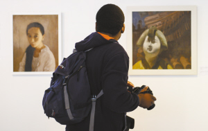 “交錯與融合”美術(shù)作品展在南非開幕 6月6日,在南非約翰內(nèi)斯堡舉行的“交錯與融合”美術(shù)作品展上,一名參觀者欣賞華人藝術(shù)家張銳的油畫作品。當日,作為“南非中國年”活動的一部分,由華人藝術(shù)家張銳與南非11名畫家共同參與的“交錯與融合”美術(shù)作品展舉行。新華社發(fā)