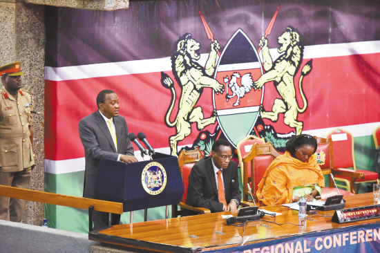 肯尼亞舉辦地區(qū)會(huì)議呼吁國(guó)際社會(huì)合作反恐   6月27日,在肯尼亞內(nèi)羅畢,肯尼亞總統(tǒng)肯雅塔(左)在地區(qū)會(huì)議上致閉幕辭??夏醽喺?5日至27日在首都內(nèi)羅畢舉辦地區(qū)會(huì)議,探討如何應(yīng)對(duì)暴力極端主義和恐怖活動(dòng),并呼吁國(guó)際社會(huì)合作反恐。(本欄文圖均據(jù)新華社發(fā))