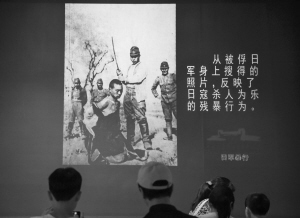 “死難同胞300000余人”,幾個(gè)白色大字刺痛人心。“南京大屠殺”是日軍在中國(guó)制造的震驚世界的大屠殺,超過(guò)30萬(wàn)中國(guó)人在大屠殺中遇難。長(zhǎng)江邊堆積的尸體、被燒焦的骸骨、被活埋的中國(guó)人以及日軍的殺人比賽……這些選自日本人和西方記者拍攝的照片,以無(wú)可辯駁的史實(shí)揭露了侵華日軍南京大屠殺的罪行。