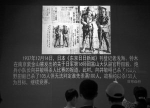 ?、?nbsp;7月12日,觀眾在中國(guó)人民抗日戰(zhàn)爭(zhēng)紀(jì)念館觀看1937年12月14日,日本《東京日日新聞》記者淺海、鈴木在南京紫金山麓發(fā)出的關(guān)于日軍第16師團(tuán)富山大隊(duì)副官野田毅、炮兵小隊(duì)長(zhǎng)向井敏明殺人比賽的報(bào)道。