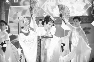 一向在表演中威嚴十足的特型演員劉勁,這次竟穿上女裝反串起了楊貴妃,和反串唐明皇的妻子胡艷萍一同演繹了一首經(jīng)典的《貴妃醉酒》。